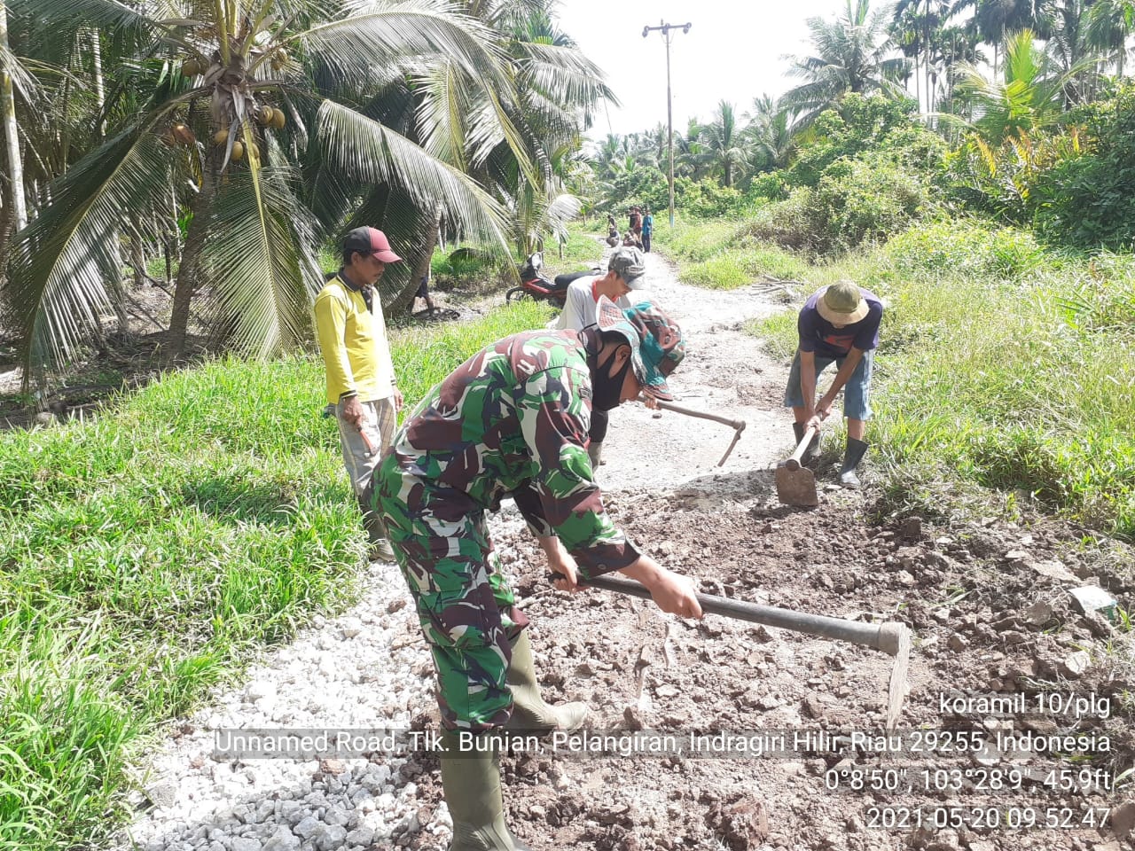 SERIBUPARITNEWS.COM, PELANGIRAN - Masih dalam kegiatan Pra TMMD Hari ketiga, Babinsa Koramil 10/Pelangiran Kodim 0314/Inhil Kopda Dodimen melaksanakan kegiatan perbaikan jalan bersama Warga Kamis (20/05/2021)