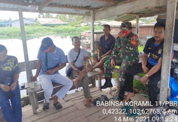 SERIBUPARITNEWS.COM, PULAUBURUNG - masih suasana Ied Mubarok Babinsa Koramil 11/Pulau Burung Kodim 0314/Inhil Sertu Yanuarsyah melaksanakan kegiatan komsos dengan warga dan tukang ojek Jumat (14/05/2021)