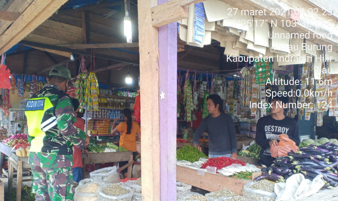 SERIBUPARITNEWS.COM, PULAUBURUNG - Babinsa Koramil 11/Pulau Burung Kodim 0314/Inhil  Sertu Arif Darmawan  tetap melaksanakan kegiatan penegakkan disiplin  Protokol Kesehatan di warung penjual sembako jalan pendidikan Desa Pulau Burung Kecamatan Pulau Burung Kab Inhil Selasa (27/04/2021)