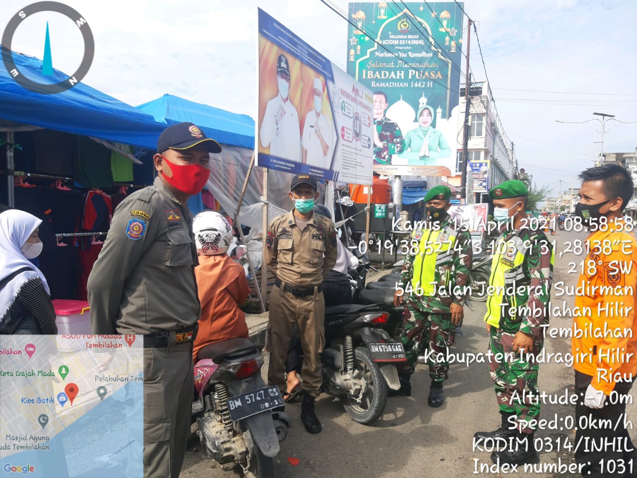 SERIBUPARITNEWS.COM, TEMBILAHAN - Sertu Surahman Babinsa Koramil 01/Tembilahan Melaksanakan Penegakan Disiplin Terpadu Protokol Kesehatan di Pos Pasar Air Mancur di Kecamatan Tembilahan Kabupaten Indragiri Hilir Kamis (15/04/2021)
