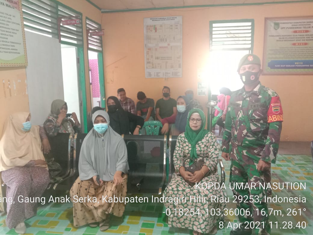 SERIBUPARITNEWS.COM, GAUNG ANAK SERKA - Babinsa Koramil 05/Gas Kodim 0314/Inhil  kopda Umar mendampingi vaksinasi sinovak tahap I kepada siswa/ siswi SMA dan SMP di Teluk Pinang Kecamatan Gas, Kab Inhil Kamis (08/04/2021)