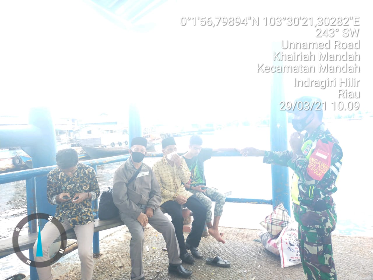 SERIBUPARITNEWS.COM, MANDAH - Guna Mencegah dan meminimalisir Penyebaran Covid -19 lebih lanjut , Serda Tulus L. Gaol Babinsa Koramil 08/Mandah terus mengupayakan penegakkan disiplin di Pelabuhan Sembuang Kelurahan Khairiah Mandah Kecamatan Mandah Senin (29/03/2021)