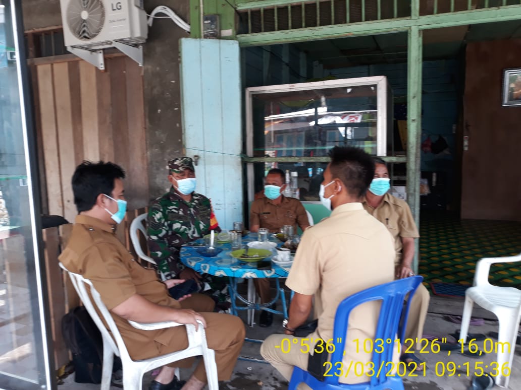 SERIBUPARITNEWS.COM,GAUNG - Babinsa Koramil 05/Gas Kodim 0314/Inhil Serka Sasmito Melaksanakan Komsos kepada Perangkat Desa di Desa Belantaraya Kecamatan Gaung Senin (23/03/2021)