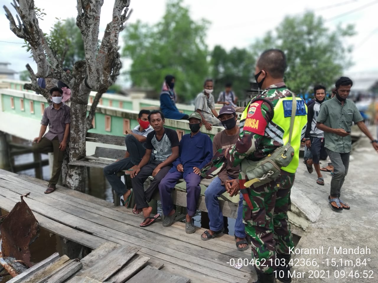 SERIBUPARITNEWS.COM,MANDAH - Babinsa Koramil 08/Mnadah Kodim 0314/Inhil Serda Erik Arianto Sibarani. Melaksanakan penegakan disiplin protokol kesehatan kepada warga di pasar Sendawa Desa Bakau Aceh kecamatan Mandah Rabu (10/03/2021)