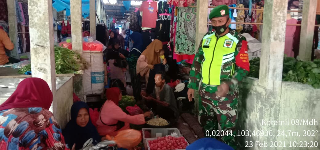 SERIBUPARITNEWS.COM, MANDAH - Di Pasar Kantin Kelurahan Khairiah Mandah, Babinsa Koramil 08/Mandah Kodim 0314/Inhil berkeliling melaksanakan Penegakkan disiplin protokol kesehatan Selasa (23/02/2021)