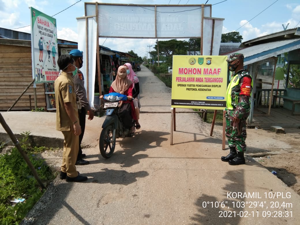 SERIBUPARITNEWS.COM, PELANGIRAN  - Serma Sri Wahyono Babinsa Koramil 10/Pelangiran Kodim 0314/Inhil Berserta Personel Polsek dan Tim kesehatan puskesmas Pelangiran melaksanakan kegiatan  Protokol Kesehatan di Kecamatan Pelangiran Kamis (11/02/2021)