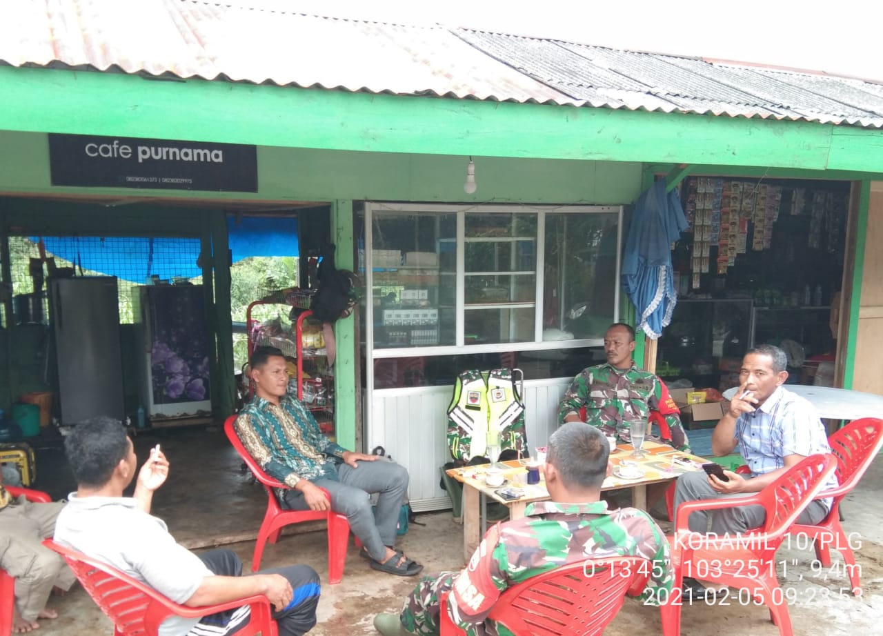 SERIBUPARITNEWS.COM, PELANGIRAN - Sertu Supriadi Babina Koramil 10/Pelangiran Kodim 0314/Inhil menjalin Komunikasi Dengan Kades Tagagiri Tama Jaya di sebuah. Warung Kelontong Kecamatan Pelangiran Jumat (05/02/2021)