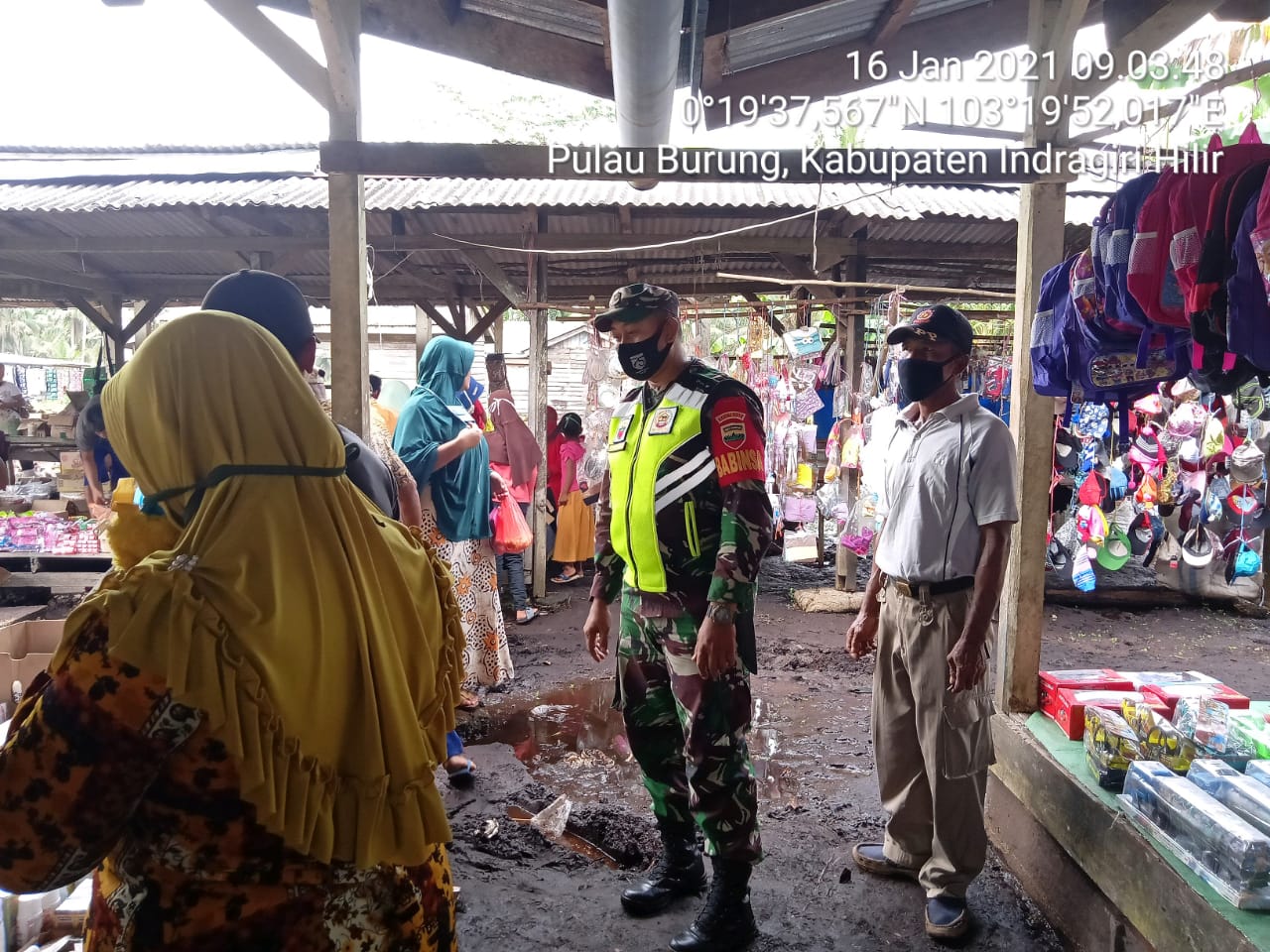 SERIBUPARITNEWS.COM, PULAU BURUNG -   Serda Supandi Babinsa Koramil 11/Pulau Burung Kodim 0314/Inhil Melaksanakan Gakplin Protokol Kesehatan Covid-19 dipasar Desa Ringin Jaya Kecamatan Pulau Burung Kab Inhil Sabtu (16/01/2021)
