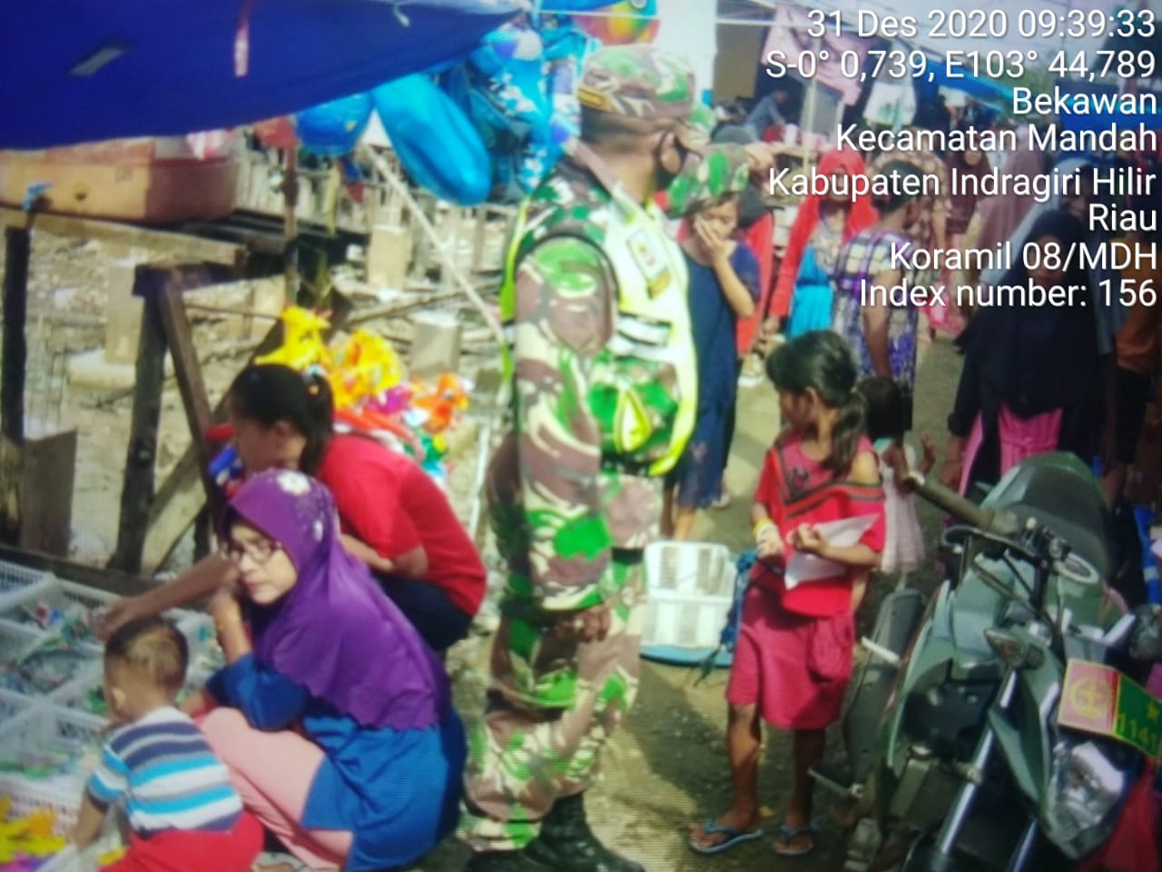 SERIBUPARITNEWS.COM, MANDAH - Babinsa Koramil 08/Mandah Kodim 0314/Inhil Serda Haris Moni Melaksanakan Gakplin Covid -19 kepada para pedagang keliling mingguan dan pengunjung di pasar tradisional Desa Bekawan Kecamatan Mandah Kab. Inhil Kamis (31/12/2020)