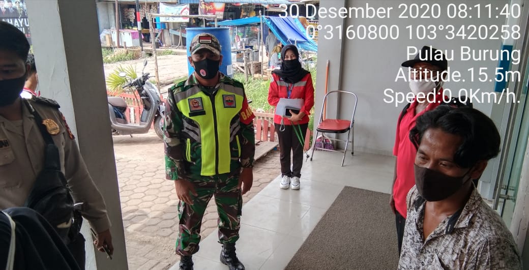 SERIBUPARITNEWS.COM, PULAU BURUNG - Babinsa Koramil 11/Pulau Burung Kodim 0314/Inhil Serda Siswanto dan Babinkamtibmas Polsek Pulau Burung Melaksanakan Gakplin Protokol kesehatan Covid-19 di ATM BNI jalan Pendidikan Desa Pulau Burung Kecamatan Pulau Burung Kab Inhil Rabu (30/12/2020)