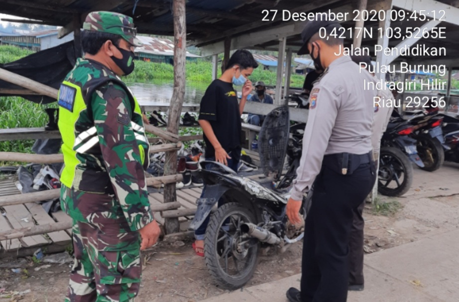 SERIBUPARITNEW.COM, PULAU BURUNG - Babinsa Koramil 11/Pulau Burung Kodim 0314/Inhil dipimpin sertu Yanuarsyah bersama 2 anggota Polsek Pulau Burung laksanakan giat Gakplin protokol kesehatan Covid-19 di Pangkalan ojek Jalan pendidikan Desa Pulau Burung Kecamatan Pulau Burung Kabupaten Indragiri Hilir Minggu (27/12/2020)
