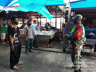 Babinsa Bakau Aceh Koramil 08/Mandah Kodim 0314/Inhil Serda Erik A. Sibarani Melaksanakan Prokes Covid -19 kepada warga yg berkunjung ke pasar