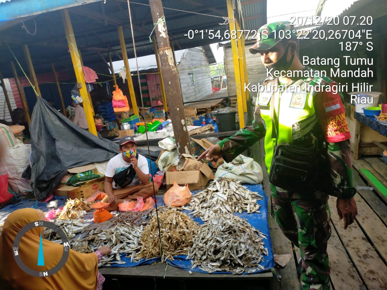 SERIBUPARITNEWS.COM, MANDAH - Babinsa Batang Tumu Koramil 08/Mandah Kodim 0314/Inhil Serda Tulus Lumban Gaol Melaksanakan Gakplin Prokes Covid -19 bersama warga pengunjung dan pedagang di pasar Tokolan Desa Batang Tumu Kecamatan Mandah Kab.Inhil Minggu (20/12/2020)