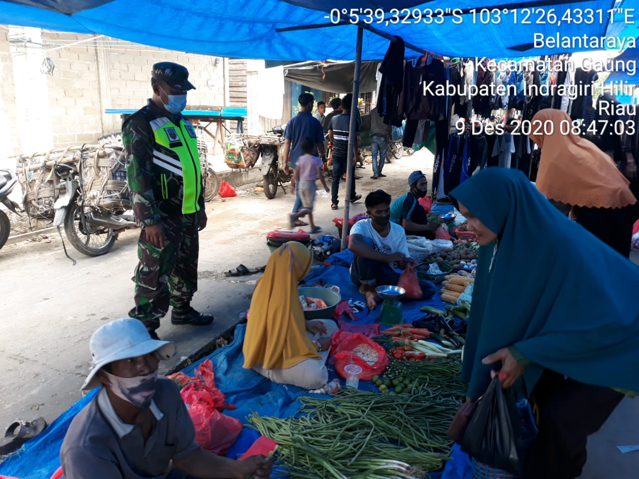 SERIBUPARITNEWS.COM, GAUNG - Serka Sasmito Babinsa Belantaraya Kodim 0314/Inhil masih melaksanakan Penegakan Disiplin Protokoler Kesehatan New Normal Penanganan Covid 19 Terpadu di desa belantaraya Kecamatan Gaung Kab. Inhil Rabu (09/12/2020)
