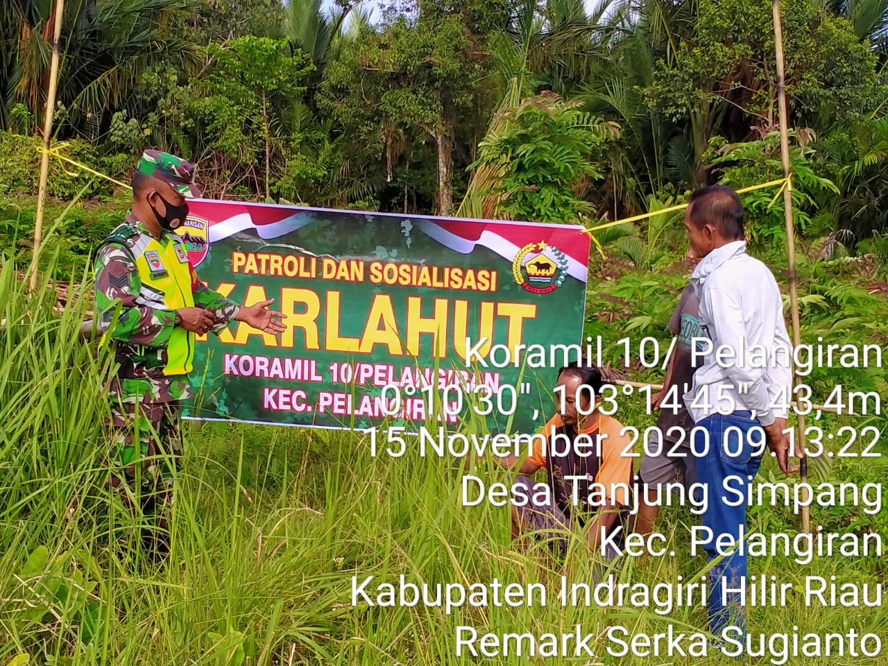 SERIBUPARITNEWS.COM, PELANGIRAN - Babinsa Tanjung Simpang Koramil 10/Pelangiran Kodim 0314/Inhil Serka Sugianto Melaksanakan Patroli dan sosialisasi Karhutla Minggu (15/11/2020)