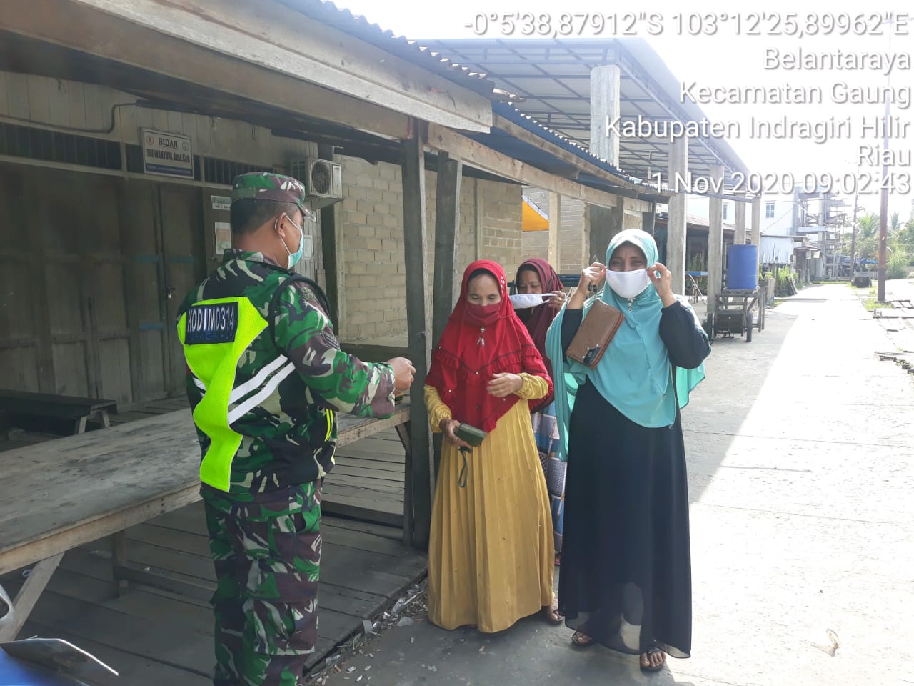 INHILNEWS.COM, GAUNG - Dalam penegakkan disiplin protokol kesehatan hari ini tampak Serka Sasmito tekun melakukan himbauan di pelabuhan,penyeberangan dan pasar di desa belantaraya Minggu (01/11/2020)