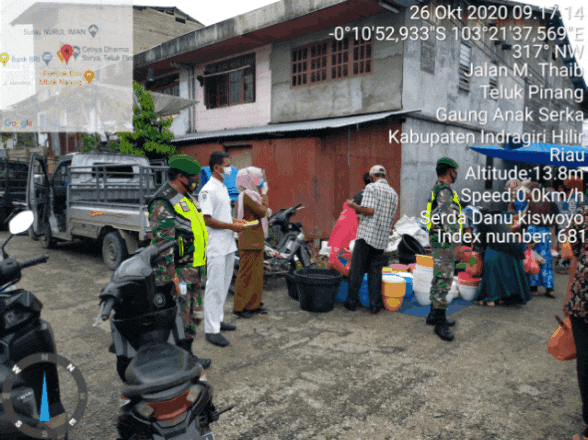 SERIBUPARITNEWS.COM,GAUNG ANAK SERKA - Kodim 0314/Inhil Melalui BabinsaKl Kelurahan Teluk Pinang Serda Danu Kiswoyo tetap serius dalam menegakkan protokol kesehatan di pasar Teluk Pinang Senin (26/10/2020)