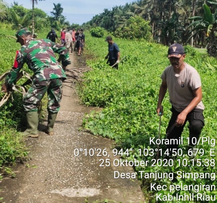 SERIBUPARITNEWS.COM, PELANGIRAN - Kodim 0314/Inhil melalui Babinsa Tanjung Simpang Koramil 10/Pelangiran bersama warga melaksanakan Gotong royong Pembersihan jalan penghubung desa Minggu (25/10/2020)