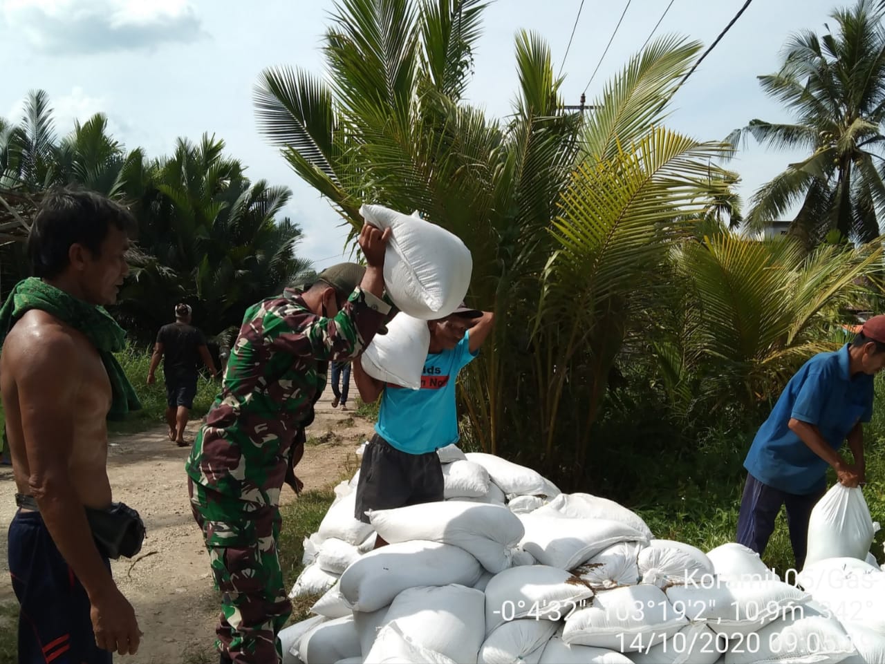 SERIBUPARITNEWS.COM, GAUNG ANAK SERKA - Kodim 0314/Inhil melalui Babinsa Lahang Hulu Koramil 05/Gaung Anak Serka Serda Jondlis Panggabean melaksanakan gotong royong bersama warga mengangkut bahan material untuk semenisasi jalan Rabu (14/10/2020)