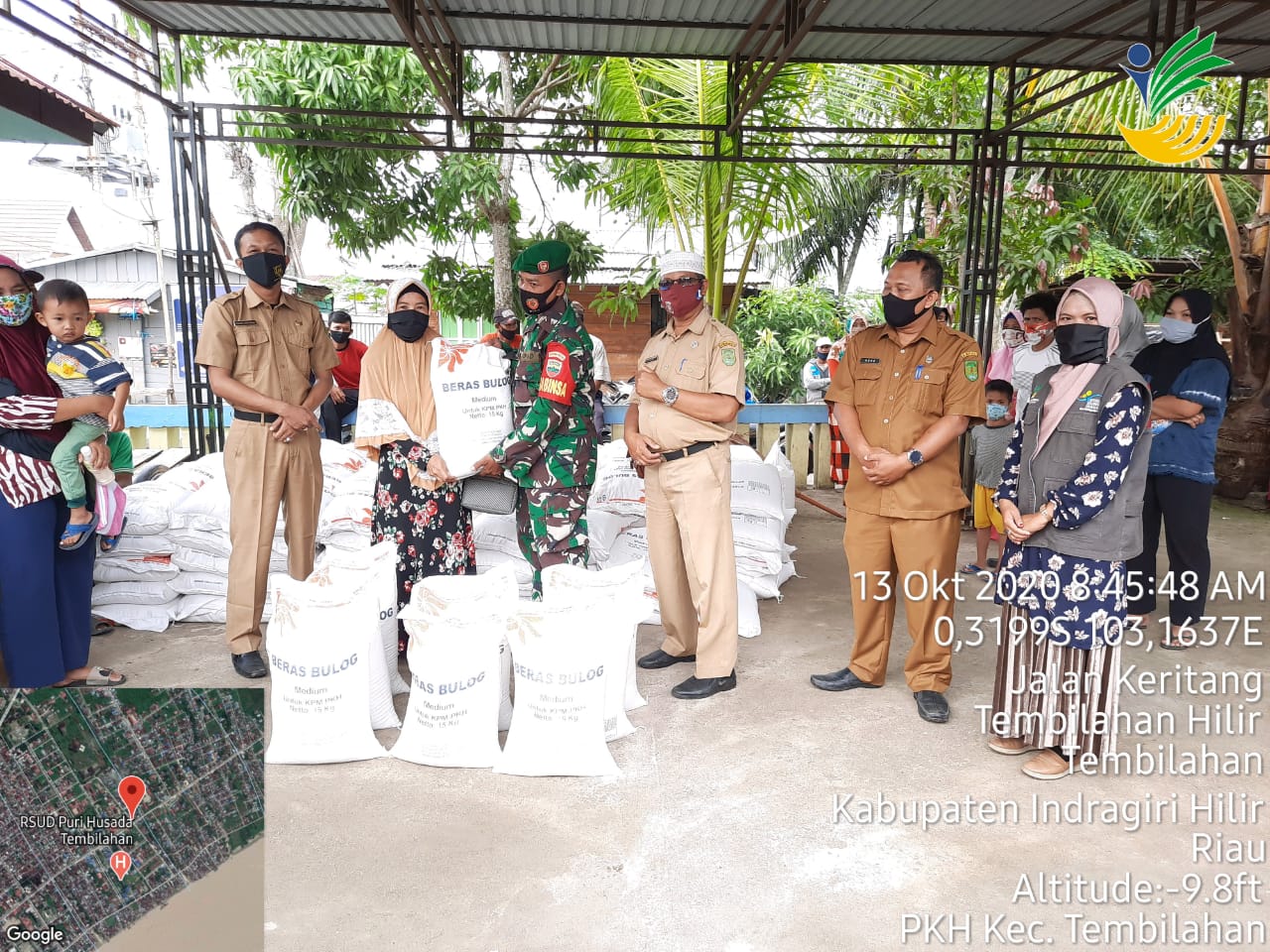 SERIBUPARITNEWS.COM,TEMBILAHAN - Babinsa Tembilahan Hilir Koramil 01 Tembilahan Kodim 0314/Inhil melaksanakan pendampingan dalam penyaluran Bantuan sosial beras (BSB) dia Halaman Kantor Luran Tembilahan Hilir Jalan Prof.M.Yamin,SH Selasa (13/10/2020)