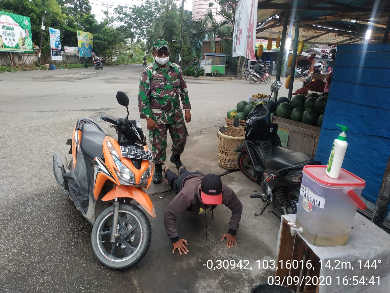 Babinsa Koramil 01 Tembilahan akan menindak setiap pemakai jalan yang tidak mematuhi protokol kesehatan dengan bentuk pembinaan persuasif maupun pembinaan fisik kebugaran pungkas Serma Indra Mukri