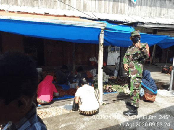 Sosialisasi yang dilakukan Babinsa berupa himbauan penggunaan masker kepada pedagang, yang terlihat masih ada beberapa pedagang yang belum memakainya