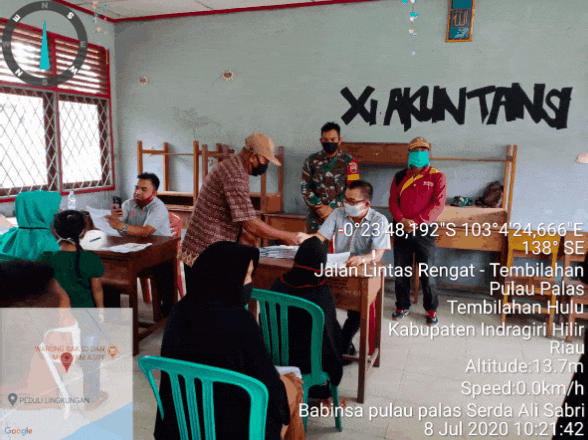 SERIBUPARITNEWS.COM,TEMBILAHANHULU - Babinsa Pulau Palas Koramil 01 Tembilahan Serda Ali Sabri melaksanakan Monitoring Penyaluran BST Tahap III Kemsos RI Rabu (08/07/2020)