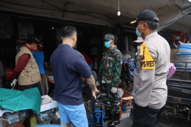 SERIBUPARITNEWS.COM TEMBILAHAN, Dandim 0314/Inhil bersama Bupati, Kapolres dan Kadispora mengelilingi pasar melihat langsung perkembangan harga sembako di pasar serta menyempatkan berkomunikasi dengan para penjual untuk mencegah penularan Covid-19 di Kabupaten Inhil, Sabtu (28/03/2020).