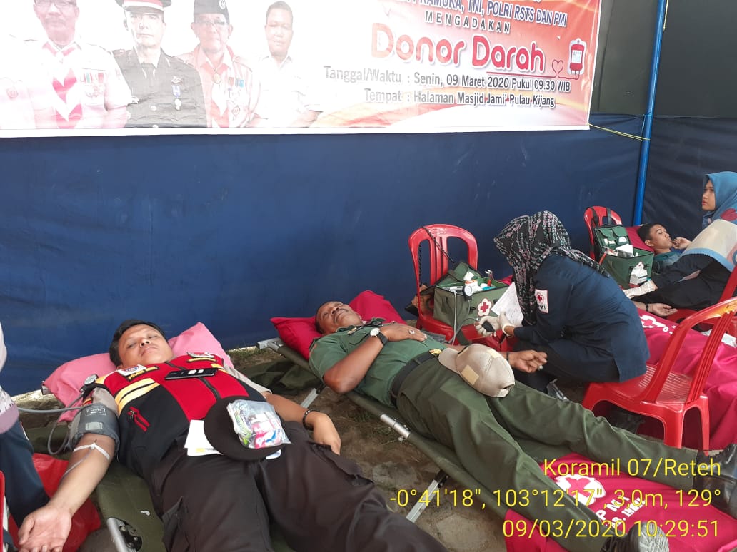 Sebagai Seorang Babinsa dan pembina pramuka, Serma Noviandi,Sertu M jupri,Serda Surya wibowo,serda Pardamean Siregar,dan Koptu Hamdani yang turut berpartisipasi dalam kegiatan sosial  donor darah dalam rangka pramuka peduli,kerjasama,Pramuka,TNI,POLRI,RSTS,PMI, dihalaman Masjid Jami' Pulau Kijang Kecamatan Reteh Kab inhil. bekerja sama dengan PMI Kabupaten Inhil.,