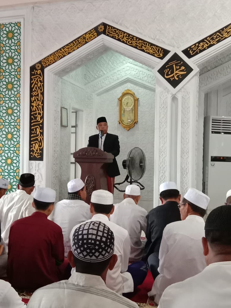Camat Tembilahan Hulu menyampaikan Sambutan pada Sholat Idul Fitri di Masjid Al-Ikhkas YAMP Parit 7 Tembilahan Hulu Baru baru ini