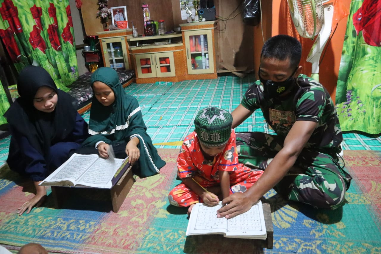 Sejumlah anggota Satgas TMMD  terlibat langsung di rumah warga yang menjadi Tempat Pendidikan Alquran (TPA), untuk membantu mengajar membaca Al-Quran dan mengaji kepada anak-anak warga setempat, Rabu (23/06/2021) malam.
