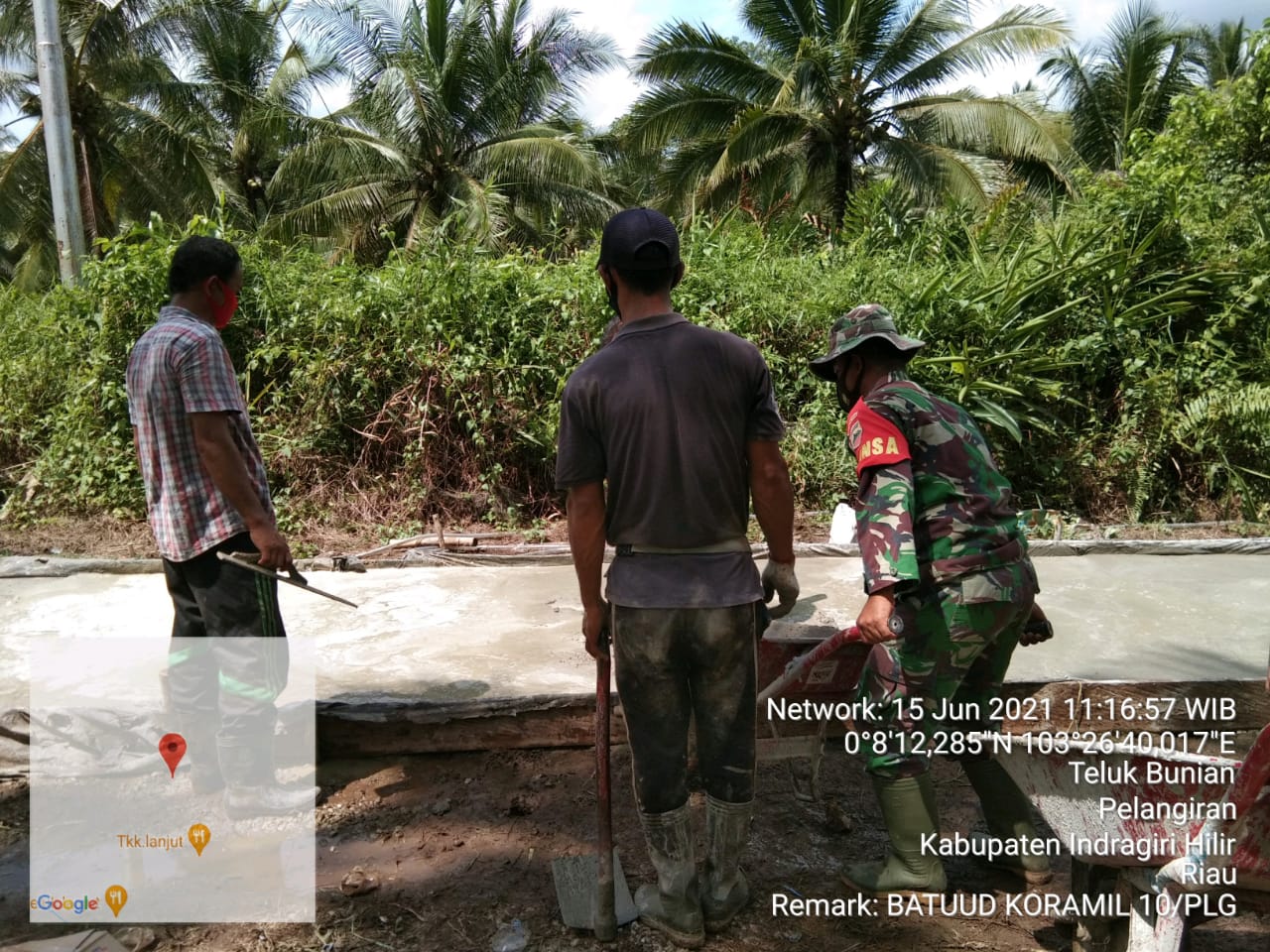 Gotong royong yang dilaksanakan melanjutkan pengerjaan fisik semenisasi jalan yang di gesa di Desa Terusan beringin jaya  Kecamatan Pelangiran ,Kab.Inhil