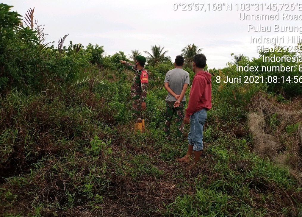 SERIBUPARITNEWS.COM, PULAUBURUNG - Babinsa Koramil 11/Pulau Burung Praka Dedi Hariyawan bersama warga sekitar melaksanakan kegiatan patroli dan sosialisasi karhutla Selasa (08/06/2021)