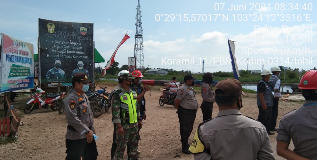 SERIBUPARITNEWS.COM, PULAUBURUNG - Babinsa Koramil 11/Pulau Burung Kodim 0314/Inhil Serda Siswanto bersama Gugus Tugas Covid-19 Kecamatan melaksanakan Kegiatan Penegakkan Protokol Kesehatan Senin (07/04/2021)