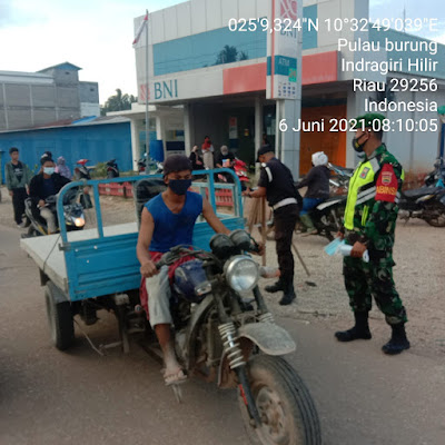 SERIBUPARITNEWS.COM,PULAUBURUNG - Dihari Minggu ini, Babinsa Koramil 11/Pulau Burung Praka Dedi Hariyawan bersama Gugus Tugas Kecamatan melaksanakan Kegiatan Penegakkan Protokol Kesehatan Covid-19 (06/06/2021)