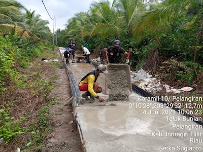 Bersama warga di Desa Terusan beringin jaya Kecamatan Pelangiran ,Kabupaten Indragiri Hilir terus menggenjot realisasi fisik sehingga semenisasi jalan ini dapat segera rampung sesuai jadwal