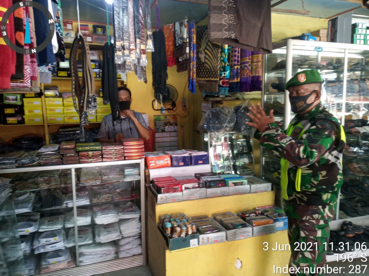 Babinsa menghimbau warganya agar memakai masker dan menjaga jarak dan juga menyediakn fasilitas pencuci tangan bagi pemilik usaha