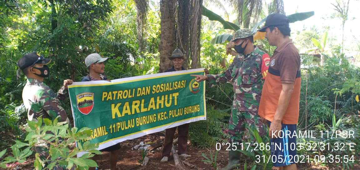 SERIBUPARITNEWS.COM, PULAUBURUNG - Babinsa Koramil 11/Pulau Burung Kodim 0314/Inhil Sertu Arif Darmawan melaksanakan kegiatan  patroli dan sosialisasi karhutla Senin  (31/05/2021)