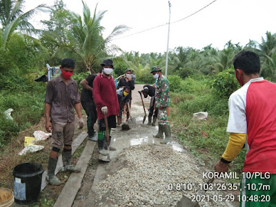 SERIBUPARITNEWS.COM, PELANGIRAN - Babinsa Koramil 10/Pelangiran Kodim 0314/Inhil Serma Sri wahyono melaksanakan kegiatan komsos berupa gotong royong Kelanjutan Semenisasi Jalan Pra TMMD Tahun 2021 bersama warga Sabtu (29/05/2021)