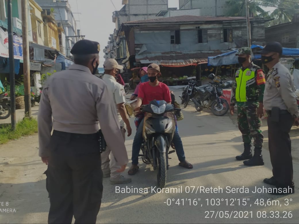 SERIBUPARITNEWS.COM,Pulau Kijang," – Dalam menekan angka penularan Covid-19 di Wilayah Koramil 07/Reteh, melakukan Himbauan protokol Kesehatan di jalan dan di Pasar tradisional Pulau Kijang Kecamatan Reteh, Kabupaten Inhil, (27/05/21).