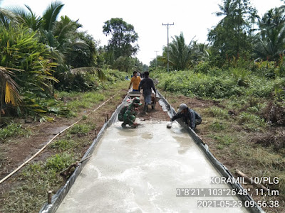 Serma Sri Wahyono Babinsa Koramil 10/Pelangiran Kodim 0314/Inhil Bersama Rampungkan Semenisasi Jalan