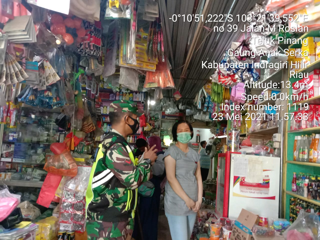 SERIBUPARITNEWS.COM, GAUNG ANAK SERKA - Babinsa Koramil 05/Gas,  Kopda Umar Nasution melaksanakan penegakan disiplin protokol kesehatan kepada Pemilik Toko di kelurahan Teluk Pinang kecamatan Gaung Anak Serka Minggu  (23/05/2021)