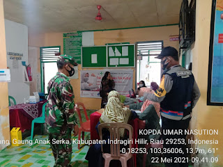 SERIBUPARITNEWS.COM, GAUNG ANAK SERKA - Babinsa Koramil 05/Gas Kodim 0314/Inhil Kopda Umar Nasution melaksanakan pendampingan penyuntikan  Vaksin Covid -19 Sabtu (22/05/2021)