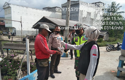 SERIBUPARITNEWS.COM, PULAUBURUNG - Babinsa Koramil 11/Pulau Burung Kodim 0314/Inhil  Serda Siswanto bersama Babinkamtibmas,tenaga kesehatan dan Kepala  desa Sungai Danai melaksanakan Kegiatan Penegakkan Disiplin  Protokol Kesehatan Kamis (20/05/2021)