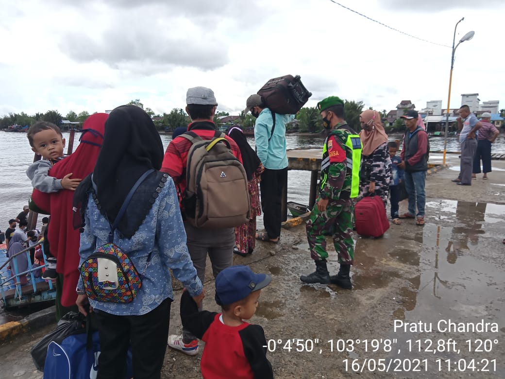 SERIBUPARITNEWS.COM, GAUNG ANAK SERKA - Masih di lebaran keempat, Babinsa Koramil 05/Gas, Pratu Candra melaksanakan penegakan disiplin protokol kesehatan di pelabuhan Penumpang Desa Kuala Lahang Kecamatan Gaung kecamatan Gas (16/05/2021)