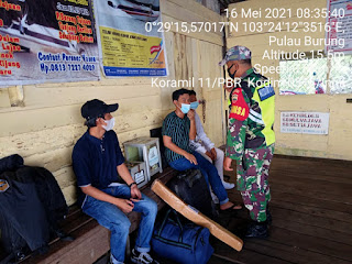 SERIBUPARITNEWS.COM,PULAUBURUNG - Di Lebaran Hari Keempat, Babinsa Koramil 11/Pulau Burung Kodim 0314/Inhil  Serda Siswanto tetap memfokuskan  melaksanakan Kegiatan Penegakkan Disiplin  Protokol Kesehatan Covid-19 Minggu (16/05/2021)