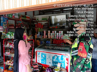 SERIBUPARITNEWS.COM, GAUNG ANAK SERKA - Di Aidil Fitri di hati kemenangan inin, Babinsa Koramil 05/Gas,  Kopda Umar   tetap melaksanakan penegakan disiplin protokol kesehatan di kelurahan Teluk pinang Jumat (14/05/2021)