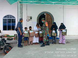 SERIBUPARITNEWS.COM, PULAUBURUNG - Batuud Koramil 11/Pulau Burung Kodim 0314/Inhil Sertu Arif Darmawan Memberikan Bingkisan menjelang Lebaran Selasa (11/05/2021)