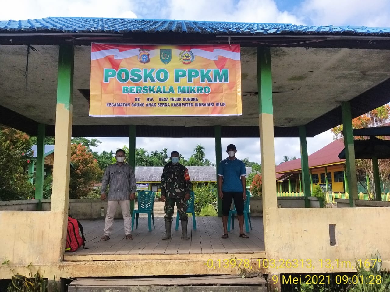 SERIBUPARITNEWS.COM, GAUNG ANAK SERKA - Babinsa  Koramil 05/Gas Kodim 0314/Inhil  Serka Nawawi bersama warga  mendirikan posko PPKM  di desa teluk Sungka Kecamatan Gaung Anak Serka Minggu (09/05/2021)