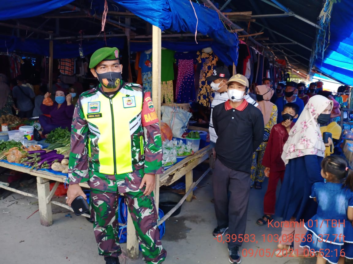 SERIBUPARITNEWS.COM, TEMBILAHAN - Serda Ali Sabri Babinsa Koramil 01/Tembilahan Kodim 0314/Inhil bersama aparatur desa melaksanakan kegiatan penegakan disiplin protokol kesehatan Minggu (09/05/2021)